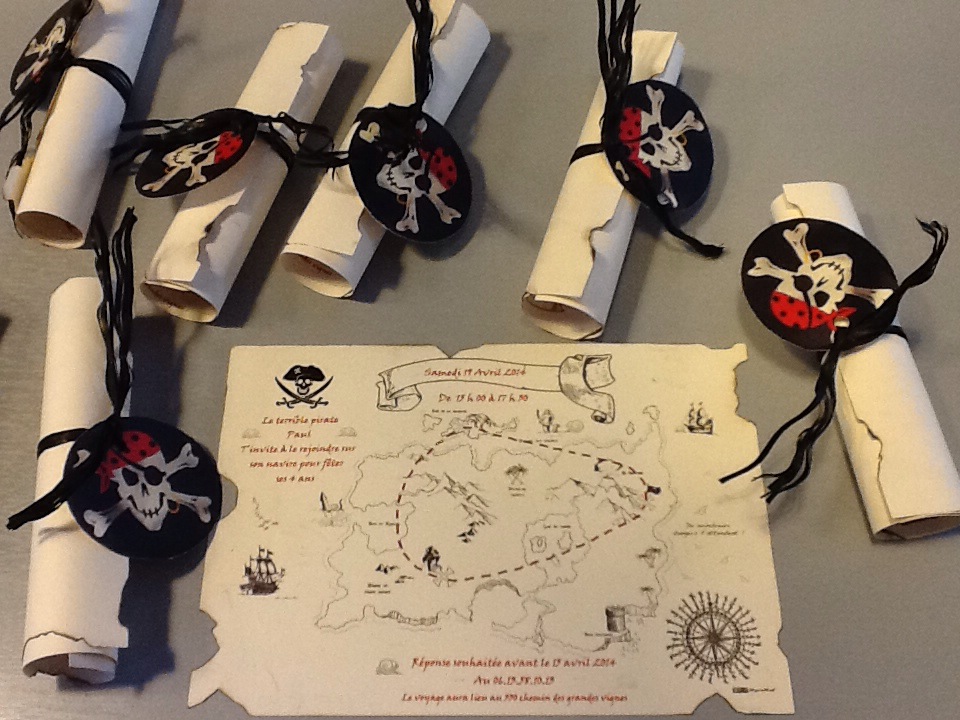 Première étape, les invitations : Pour réaliser celles ci , je suis allée chercher sur internet une image de carte. J’ai agrémenté celle ci du texte d’invitation et d’un tracé de carte au trésor. Pour qu’elle ressemble à une vrai carte en parchemin, j’ai brûlé le tour. Ensuite je l’ai roulée et maintenue avec un morceau de rafia, puis j’ai mis une étiquette avec une tête de pirate et le prénom des copains invités.