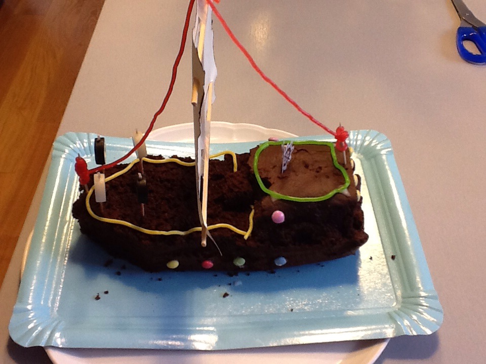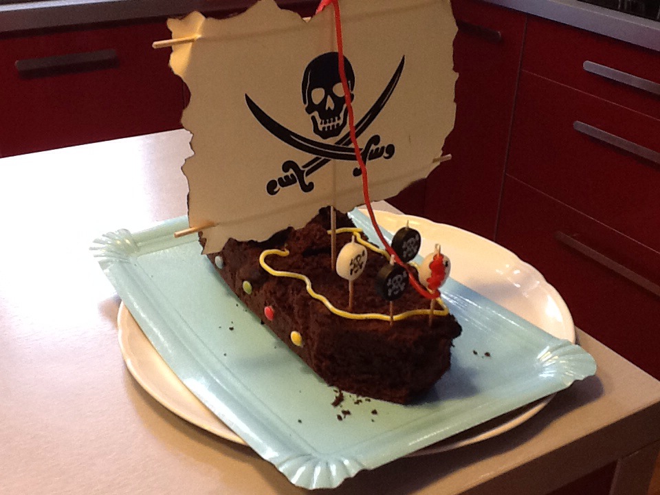 Pour transformer ce cake en bateau, découper un bout du cake en biais pour faire l’avant du bateau. Découper ensuite une bande sur le dessus du cake pour réaliser la cabine. J’ai réalisé la voile en imprimant une tête de mort sur une feuille et que j’ai ensuite fixé sur des piques à brochette en bois. Pour le reste de la décoration, j’ai utilisé des bonbons type smarthies pour les canons et des bonbons type scoubidou pour les cordages. Pour coller les bonbons, réaliser un gla9age royal (sucre glace + jus d citron).Voilà le résultat